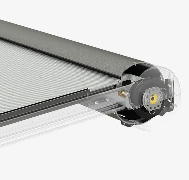 Rozwijanie i zwijanie tkaniny dokonuje się poprzez rurę nawojową i jest napędzane elektrycznie. System daje możliwość montażu modułowego.